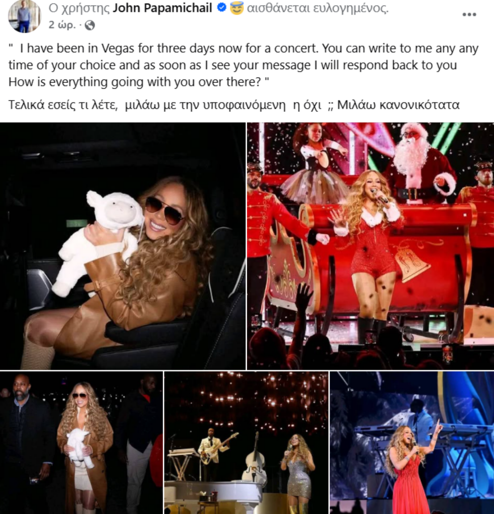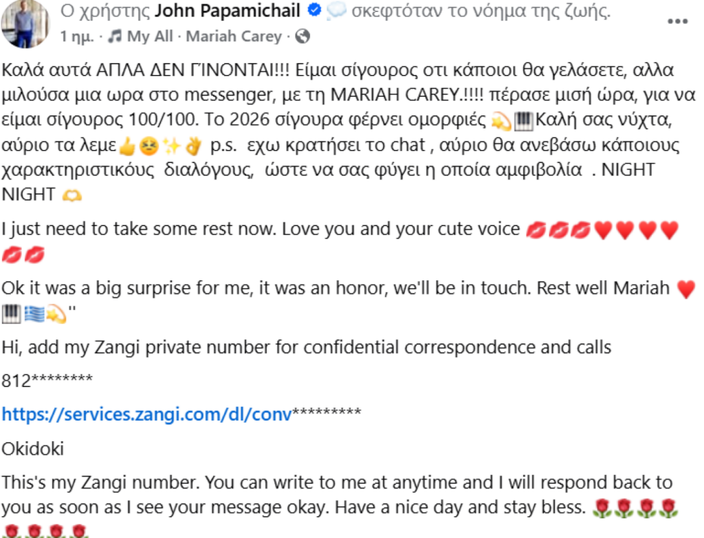 «Καλά αυτά απλά δεν γίνονται. Είμαι σίγουρος ότι κάποιοι θα γελάσετε, αλλά μιλούσα μια ώρα στο Messenger με τη Μαράια Κάρεϊ. Πέρασε μισή ώρα, για να είμαι σίγουρος 100/100. Το 2026 σίγουρα φέρνει ομορφιές. Καλή σας νύχτα, τα λέμε αύριο. Υ.Γ. Έχω κρατήσει τη συνομιλία, αύριο θα ανεβάσω κάποιους χαρακτηριστικούς διαλόγους, ώστε να σας φύγει η όποια αμφιβολία. Καληνύχτα» και πρόσθεσε: «Χρειάζομαι λίγο ξεκούραση τώρα. Σ’ αγαπώ εσένα και τη γλυκιά φωνή σου. Εντάξει, ήταν μια μεγάλη έκπληξη για εμένα, ήταν τιμή μου, θα είμαστε σε επαφή. Ξεκουράσου καλά Μαράια» έγραψε, επισημαίνοντας ότι θα επανέλθει με πειστήρια…