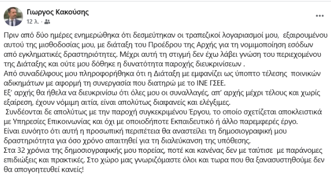 «Πριν από δύο ημέρες ενημερώθηκα ότι δεσμεύτηκαν οι τραπεζικοί λογαριασμοί μου, εξαιρουμένου αυτού της μισθοδοσίας μου, με διάταξη του Προέδρου της Αρχής για τη νομιμοποίηση εσόδων από εγκληματικές δραστηριότητες. Μέχρι αυτή τη στιγμή δεν έχω λάβει γνώση του περιεχομένου της Διάταξης και ούτε μου δόθηκε η δυνατότητα παροχής διευκρινίσεων .