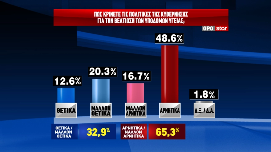 Το 70,6% των ερωτηθέντων κρίνει αρνητικά και μάλλον αρνητικά το έργο της κυβέρνησης. Το 65,3% κρίνει αρνητικά και μάλλον αρνητικά τις πολιτικές της κυβέρνησης για τη βελτίωση των υποδομών Υγείας. Το 67,2% κρίνει αρνητικά και μάλλον αρνητικά τις πολιτικές της κυβέρνησης για την αντιμετώπιση του δημογραφικού και την στήριξη της ελληνικής οικογένειας.