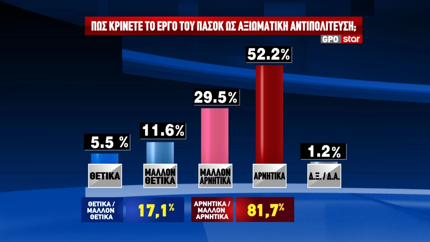Το 81,7% των ερωτηθέντων αξιολογεί αρνητικά και μάλλον αρνητικά το έργο του ΠΑΣΟΚ στην θέση της αξιωματικής αντιπολίτευσης.