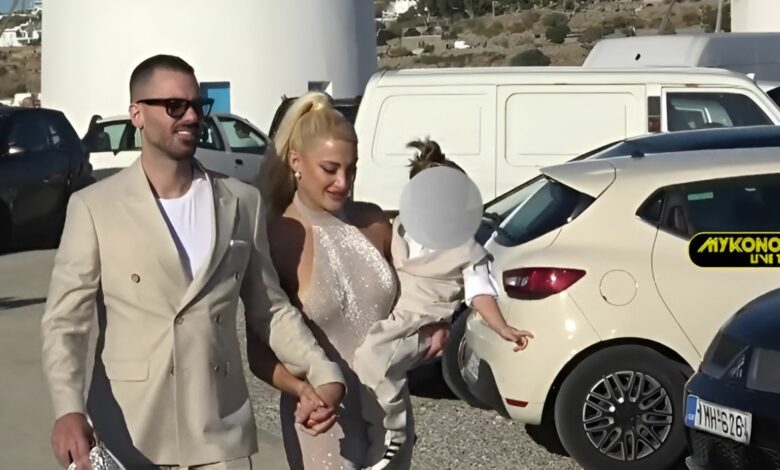Το μυστήριο τελέστηκε στο εκκλησάκι του Αγίου Χαραλάμπους στην Μύκονο, με την influencer να καταφθάνει χέρι – χέρι με τον επιχειρηματία Δημήτρη Ρομπέρτο και τον μικρό Πάρη στην αγκαλιά της.