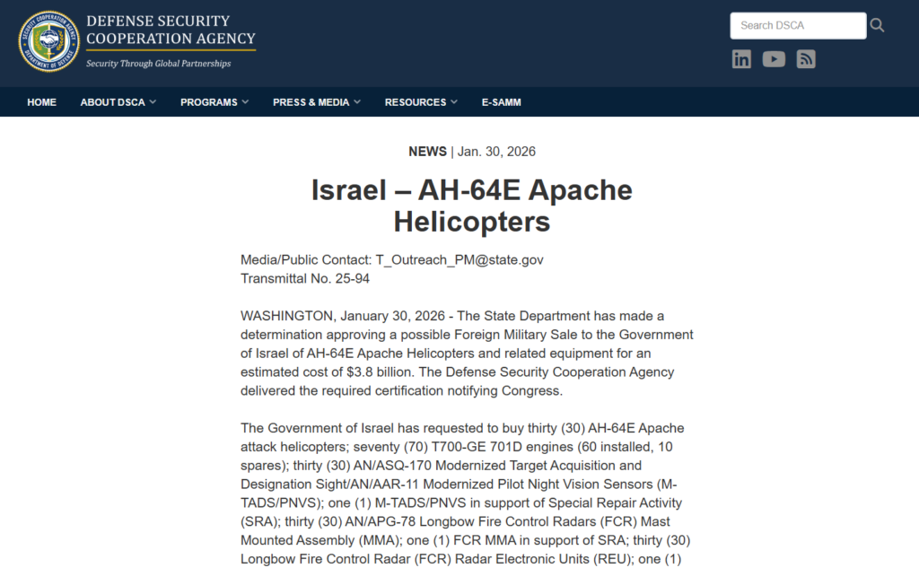 Η κυβέρνηση του προέδρου των ΗΠΑ, Ντόναλντ Τραμπ, ανακοίνωσε χθες Παρασκευή ότι ενέκρινε την πώληση 30 επιθετικών ελικοπτέρων AH-64E Apache και συναφούς υλικού και υπηρεσιών στο Ισραήλ, τον στενότερο σύμμαχο της Ουάσιγκτον στη Μέση Ανατολή, έναντι τιμήματος που προβλέπεται ότι θα ανέλθει συνολικά σε 3,8 δισεκατομμύρια δολάρια, με φόντο την τήρηση της εύθραυστης κατάπαυσης του πυρός στη Λωρίδα της Γάζας.