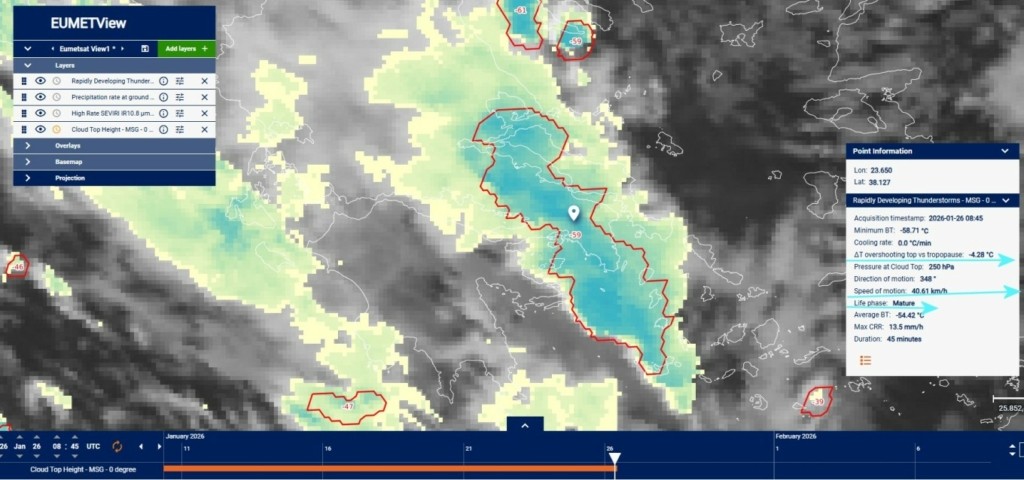 Η καταιγίδα που καταγράφηκε τις πρωινές ώρες της 26ης Ιανουαρίου, όπως αποτυπώθηκε από τα δορυφορικά προϊόντα nowcasting του EUMETSAT (Rapidly Developing Thunderstorms), παρουσίασε όλα τα χαρακτηριστικά ενός οργανωμένου και ώριμου καταιγιδοφόρου συστήματος, με αυξημένο δυναμικό έντονων φαινομένων, γράφει ο μετεωρολόγος.