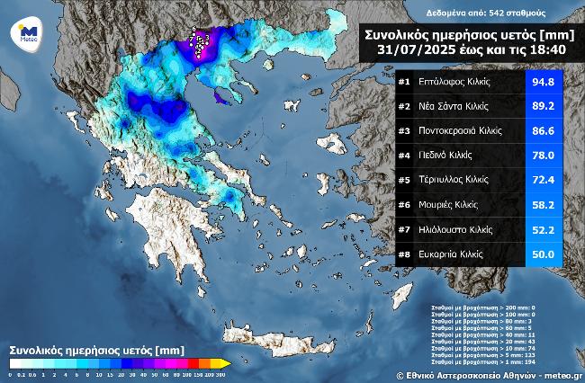 Τοπικές βροχές και καταιγίδες σημειώθηκαν στα κεντρικά και βόρεια την Πέμπτη 31 Ιουλίου 2025. Σύμφωνα με το δίκτυο αυτόματων μετεωρολογικών σταθμών του Εθνικού Αστεροσκοπείου Αθηνών / meteo.gr, τα πλέον αξιόλογα ύψη βροχής σημειώθηκαν κυρίως σε τμήματα της Μακεδονίας και της Θεσσαλίας, με το μεγαλύτερο ύψος βροχής να καταγράφεται στο μετεωρολογικό σταθμό στον Επτάλοφο Κιλκίς με 94.8mm. Στον παρακάτω χάρτη παρουσιάζεται η χωρική κατανομή της βροχής έως τις 18:40 της Πέμπτης 31 Ιουλίου 2025 και στον πίνακα τα 8 μεγαλύτερα ύψη βροχής.