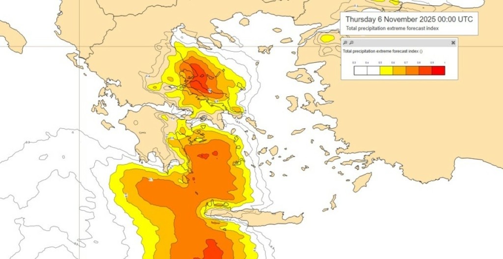 Ειδικότερα, σύμφωνα με άρθρο του Θοδωρή Κολυδά στην προσωπική ιστοσελίδα του, ο χάρτης EFI που αφορά στην ολική βροχόπτωση για την Πέμπτη (06/11), προβλέπει 24ωρη συσσώρευση υετού με εντυπωσιακά υψηλές τιμές κατά την επικείμενη κακοκαιρία.