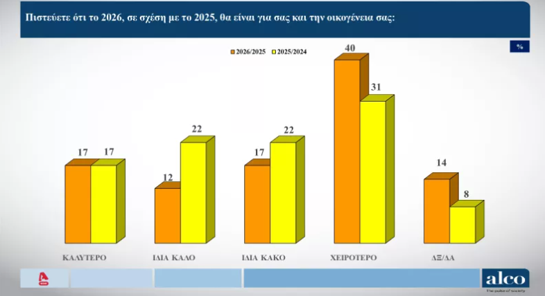 Μόλις το 17% θεωρεί ότι το 2026 θα είναι καλύτερο, ενώ το 12% πιστεύει ότι θα είναι το ίδιο καλό. Ένα ποσοστό 14% δηλώνει ότι δεν γνωρίζει ή δεν απαντά.