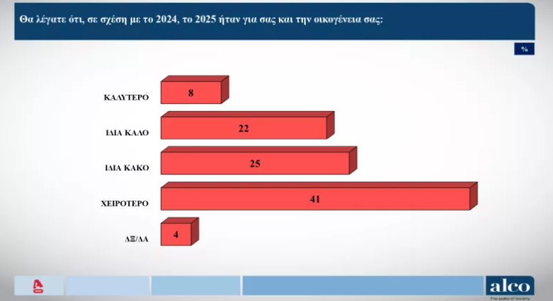 Το 41% δηλώνει ότι το 2025 ήταν χειρότερο σε σχέση με το 2024, ενώ ένα επιπλέον 25% απαντά ότι ήταν ίδια κακό.