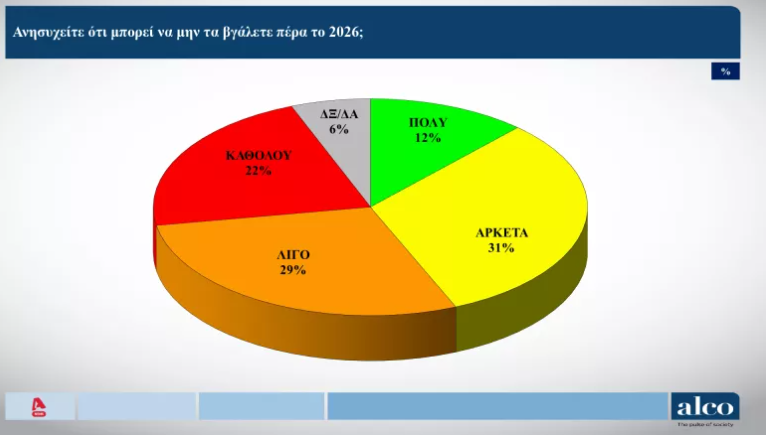 Το 31% των ερωτηθέντων δηλώνει ότι ανησυχεί αρκετά πως δεν θα καταφέρει να τα βγάλει πέρα το 2026 και το 12% πολύ, ενώ το 29% απαντά ότι ανησυχεί λίγο. Αντίθετα, το 22% δηλώνει ότι δεν ανησυχεί καθόλου, ενώ το 6% απαντά ότι δεν απαντά.