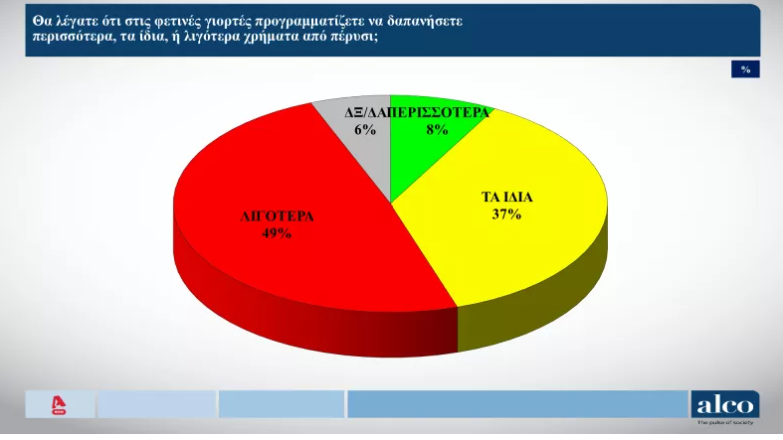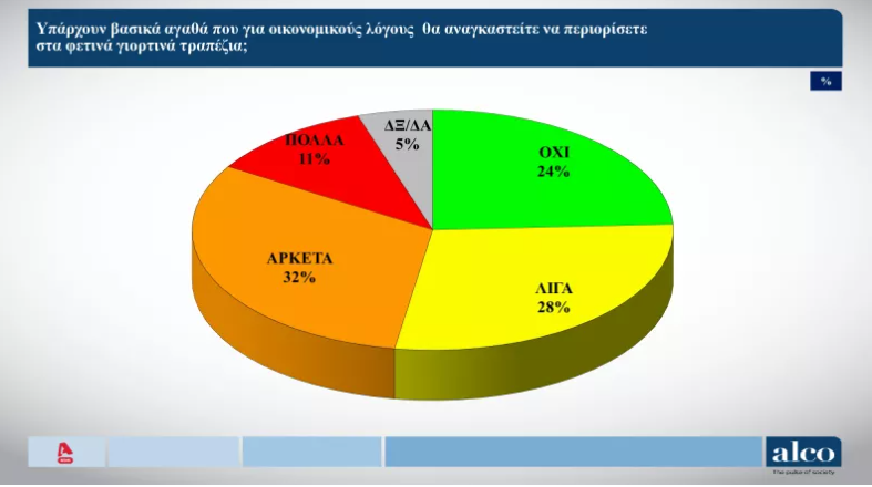 Σχετικά με το γιορτινό τραπέζι το 32% λέει ότι θα αναγκαστεί να περιορίσει αρκετά προϊόντα, το 28% λίγα και το 11% πολλά. Επιπλέον, το 49% λέει ότι θα δαπανήσει λιγότερα σε σύγκριση με πέρυσι, το 37% τα ίδια και μόλις το 8% περισσότερα.