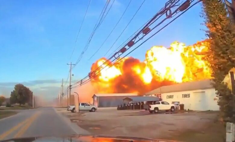 Άλλα πλάνα εικονίζουν πελώρια πυρκαγιά, σε έκταση εκατοντάδων μέτρων, σε περιοχή με υπόστεγα και χώρους στάθμευσης.