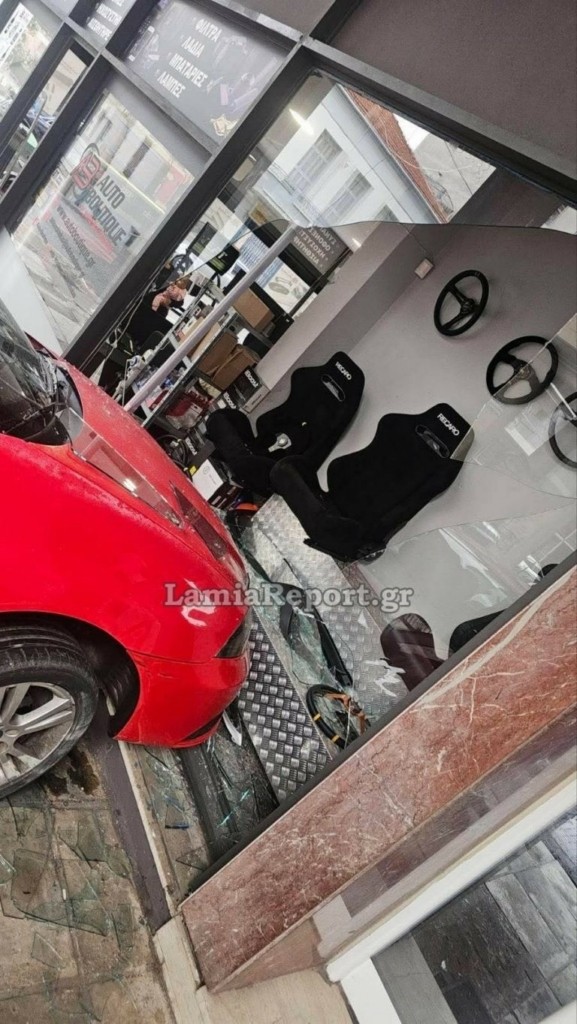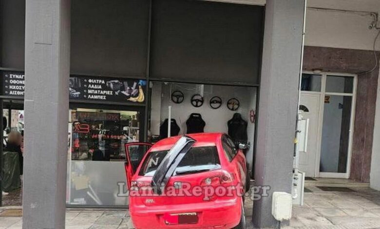 Λαμία: Αυτοκίνητο γλίστρησε και καρφώθηκε σε βιτρίνα μαγαζιού (Photos)