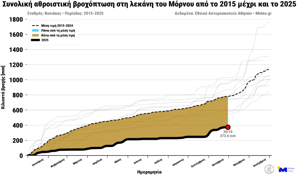 Όπως μας εξήγησε η μείωση οφείλεται κυρίως στην παρατεταμένη ξηρασία και την έλλειψη χιονοπτώσεων τα τελευταία χρόνια. Επιπλέον, τόνισε ότι «οι μετρήσεις από τους δύο σταθμούς του Αστεροσκοπείου στη λεκάνη του Μόρνου δείχνουν τη χαμηλότερη επίδοση βροχοπτώσεων της τελευταίας δεκαετίας, ενώ η επιφάνεια της λίμνης έχει περιοριστεί από 14-15 τετραγωνικά χιλιόμετρα σε μόλις 7.9», σύμφωνα με την πιο πρόσφατη φωτογραφία του meteo.gr που τραβήχτηκε στις 30/10.