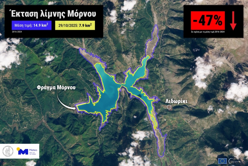 Παράλληλα, και τα τελευταία δορυφορικά δεδομένα του Εθνικού Αστεροσκοπείου Αθηνών επιβεβαιώνουν τη δραματική μείωση. Η έκταση της λίμνης έχει περιοριστεί στα 7.9 τετραγωνικά χιλιόμετρα, μειωμένη κατά 47% σε σχέση με τον μέσο όρο της τελευταίας δεκαετίας.