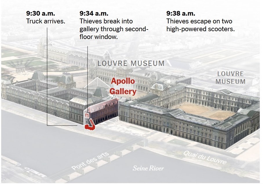 Με τις έρευνες για τους δραστες να παραμένουν άκαρπες και τα ερωτήματα να παραμένουν αναπάντητα, ξετυλίγεται το χρονικό των μόλις επτά λεπτών που χρειάστηκαν οι κλέφτες για να ληστέψουν ασύλληπτης αξίας κοσμήματα από το Λούβρο.
