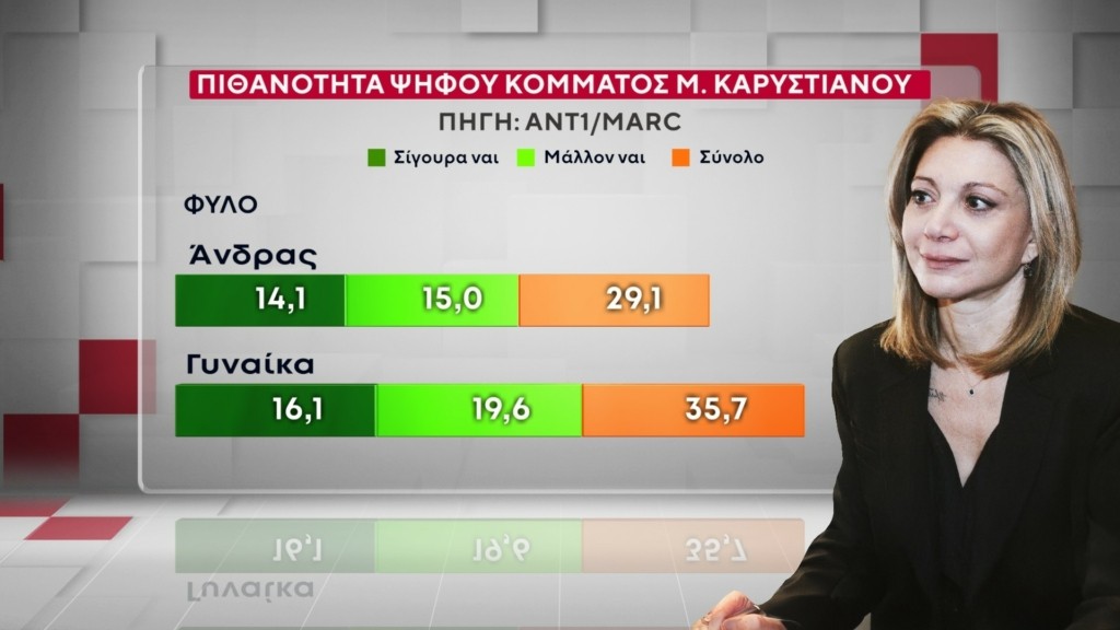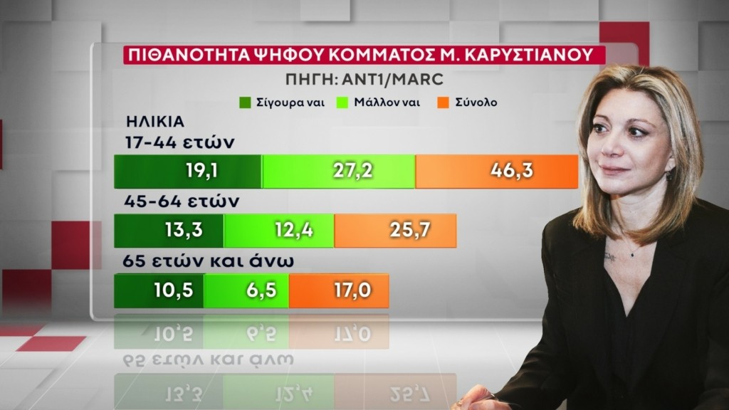 Την Μαρία Καρυστιανού θα ψήφιζε το 35,7% των γυναικών έναντι 29,1% των ανδρών. Η μεγαλύτερη «δεξαμενή» ψήφων προέρχεται από τις ηλικίες 17-44 ετών με το ποσοστό να ανέρχεται στο 46,3%. Το 25,7% θα προερχόταν από τις ηλικίες 45-64 ετών και το 17% από 65 ετών και άνω.