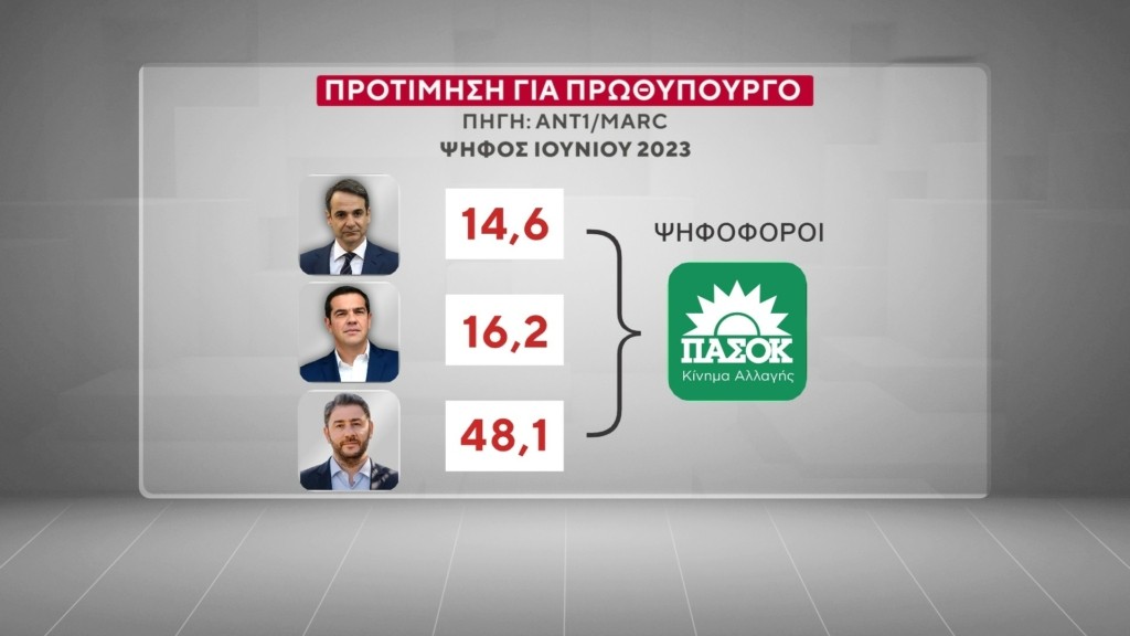 Ως προς την προτίμηση για Πρωθυπουργό (Ψήφος Ιουνίου 2023), το 14,6% των ψηφοφόρων του ΠΑΣΟΚ συγκεντρώνει ο Κυριάκος Μητσοτάκης, το 16,2% ο Αλέξης Τσίπρας και το 48,1% ο Νίκος Ανδρουλάκης.