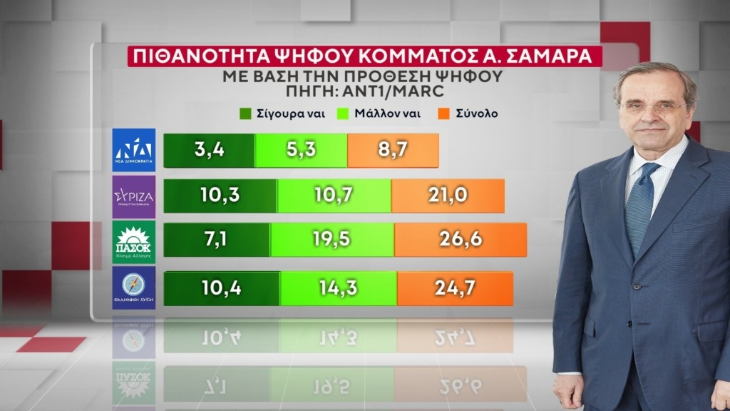Τον Αντώνη Σαμαρά θα ψήφιζε το 8,7% των ψηφοφόρων της ΝΔ, το 21% του ΣΥΡΙΖΑ, το 26,6% του ΠΑΣΟΚ, το 24,7% της Ελληνικής Λύσης, το 11,6% του ΚΚΕ, το 11,6% της Πλεύσης Ελευθερίας, το 18,7% από άλλο κόμμα και το 18% δεν έχει αποφασίσει.