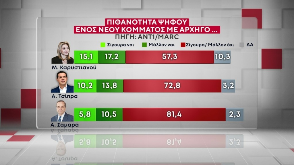 Στην πιθανότητα δημιουργίας κομμάτων από τους Μαρία Καρυστιανού, Αλέξη Τσίπρα και Αντώνη Σαμαρά εστίασε το δεύτερο μέρος της δημοσκόπησης της Marc που παρουσίασε ο ΑΝΤ1.