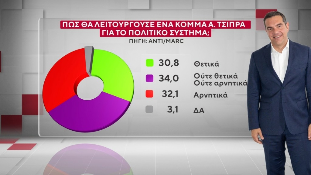 Στην ερώτηση για το πώς θα λειτουργούσε ένα κόμμα του Αλέξη Τσίπρα για το πολιτικό σύστημα, το 30,8% απάντησε θετικά, το 34% ούτε θετικά ούτε αρνητικά και το 32,1% απάντησε αρνητικά.