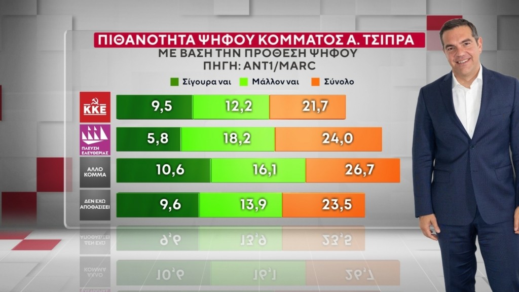 Με βάση την πρόθεση ψήφου, ένα κόμμα Τσίπρα θα το ψήφιζε το 5,7% των ψηφοφόρων της ΝΔ, το 91,3% του ΣΥΡΙΖΑ, το 23,8% του ΠΑΣΟΚ, το 23,2% της Ελληνικής Λύσης, το 21,7% του ΚΚΕ, το 24% της Πλεύσης Ελευθερίας, το 26,7% από άλλο κόμμα και το 23,5% δεν έχει αποφασίσει.