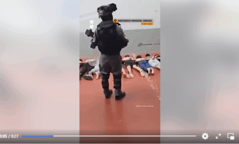 Στο βίντεο, το οποίο προέρχεται από τις φυλακές Μεγκίντο του Ισραήλ και που δημοσιοποίησε η ισραηλινή εφημερίδα Ha’aretz, Παλαιστίνιοι κρατούμενοι εμφανίζονται να είναι ξαπλωμένοι μπρούμυτα στο πάτωμα, με τα χέρια δεμένα στην πλάτη.