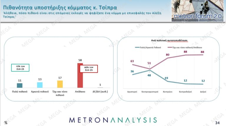 Με βάση τα στοιχεία της Metron, η πλειονότητα των Κεντροαριστερών της έρευνας και θεωρούν ότι θα επιδρούσε θετικά στο πολιτικό σκηνικό ένα κόμμα Τσίπρα (59%) και θα ήταν διατεθειμένοι να το ψηφίσουν (51%) στην εθνική κάλπη. Οι αντίστοιχες τιμές στους Αριστερούς είναι 50% και 42%. Αναπόφευκτο είναι, υπό αυτό το καθεστώς το status, ο ΣΥΡΙΖΑ να πιέζεται χάνοντας κι άλλες δυνάμεις στην πρόθεση ψήφου (από το 6.2% στο 4.9%).