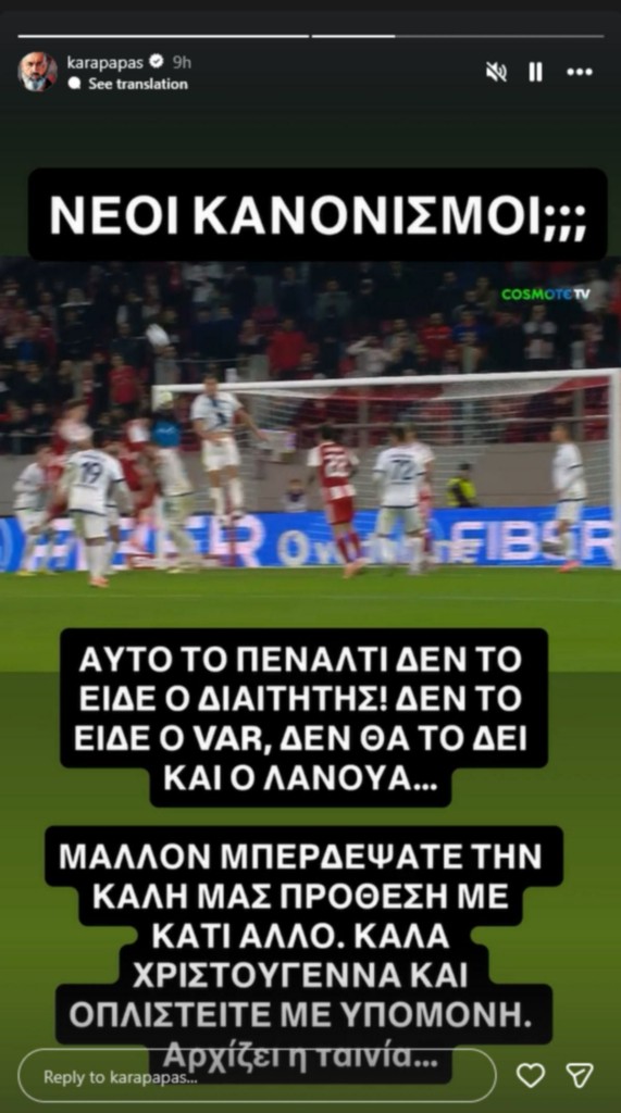 «Νέοι κανονισμοί;;; Αυτό το πέναλτι δεν το είδε ο διαιτητής! Δεν το είδε ο VAR, δεν θα το δει και ο Λανουά… Μάλλον μπερδέψατε την καλή μας πρόθεση με κάτι άλλο. Καλά Χριστούγεννα και οπλιστείτε με υπομονή. Αρχίζει η ταινία…», ανέφερε χαρακτηριστικά, εκφράζοντας τα παράπονα των ερυθρόλευκων από τη διαιτησία Ευαγγέλου.