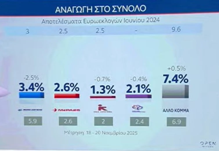 Στην αναγωγή, η ΝΔ είναι στο 29,2%, η Πλεύση Ελευθερίας 13,2%, το ΠΑΣΟΚ 12,7%, η Ελληνική Λύση 12,7%, το ΚΚΕ 7,9%, ο ΣΥΡΙΖΑ 4,6%, η Φωνή Λογικής 3,4%, η Νίκη 2,9%, το ΜέΡΑ25 2,6%, το Κίνημα Δημοκρατίας 2,1%, η Νέα Αριστερά 1,3%, Άλλο Κόμμα 7,4%.