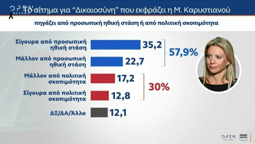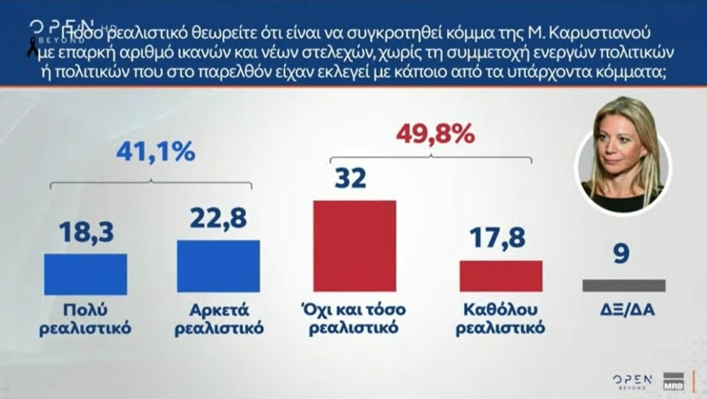 Σε ερώτηση ποιο κόμμα θεωρούν ότι μπορεί να συσπειρώσει τους ψηφοφόρους αριστερά της ΝΔ και να αποτελέσει κύριο και αξιόλογο αντίπαλο του κυβερνώντος κόμματος με πιθανότητες να κερδίσει τις εκλογές, το 30,6% απαντά «το νέο κόμμα με αρχηγό την Μ.Καρυστιανού», το 20,4% «Κανένα».
