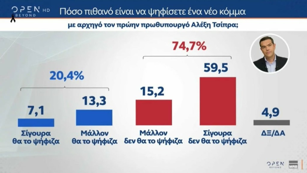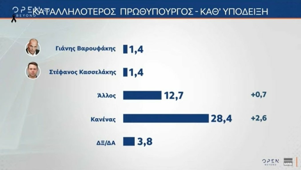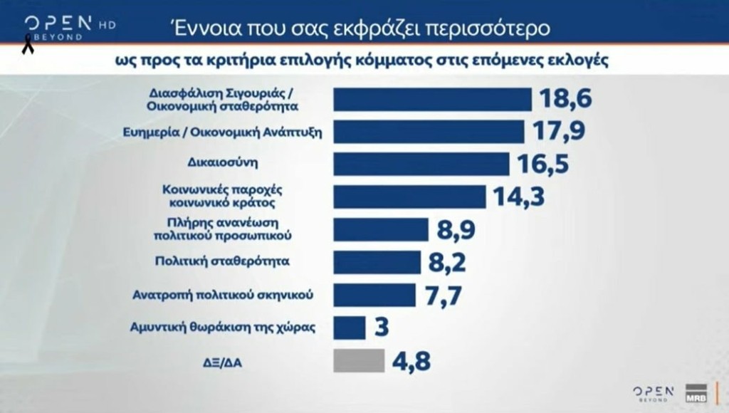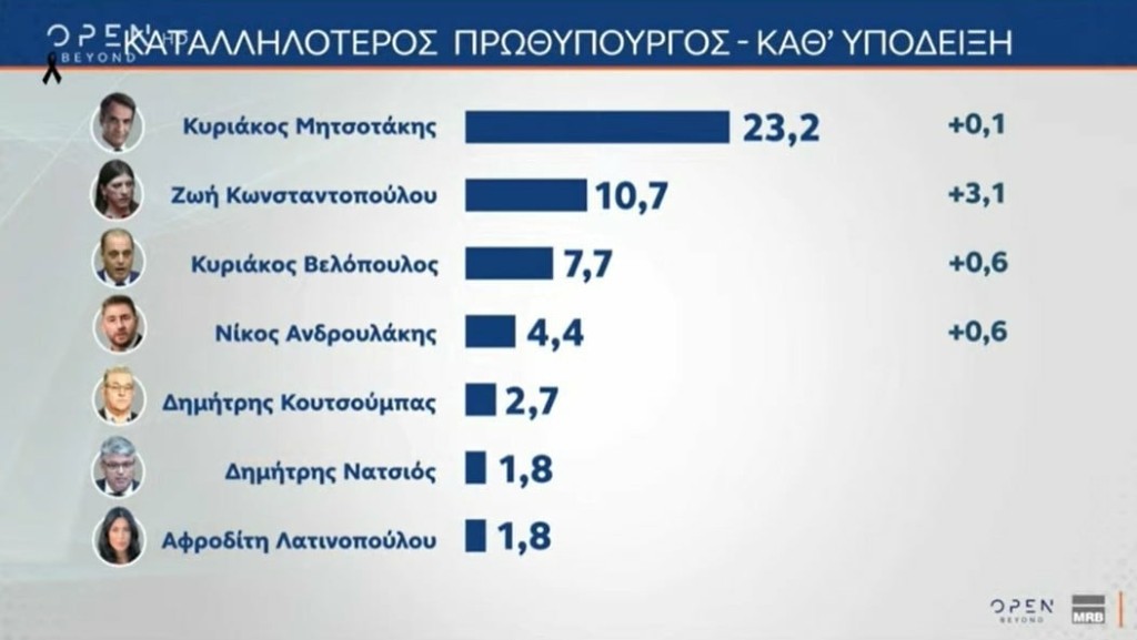 Σύμφωνα με την έρευνα της MRB, για λογαριασμό του Open, στην πρόθεση ψήφου η ΝΔ είναι στο 22,3%, δεύτερη η Πλεύση Ελευθερίας 10,1%, ακολουθούν ΠΑΣΟΚ με 9,7%, Ελληνική Λύση με 9,7%, ΚΚΕ 6%, ΣΥΡΙΖΑ 3,5%, Φωνή Λογικής 2,6%, Νίκη 2,2%, ΜέΡΑ25 2%, Κίνημα Δημοκρατίας 1,6%, Νέα Αριστερά 1%, Άλλο Κόμμα 5,7%, ενώ το Σύνολο της Αδιευκρίνιστης Ψήφου είναι στο 23,6%.
