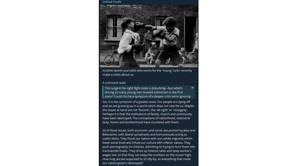 Επιπλέον, η διοργάνωση Πολεμικών Τεχνών, Ultimate Fighting Championship και τα μαχητικά αθλήματα που εμπίπτουν στο πεδίο εφαρμογής του, έχουν γίνει εστία της ακροδεξιάς. Άλλες οργανώσεις, οι οποίες είναι προφανώς πιο πολιτικές και συμμετέχουν σε δημόσιες εκδηλώσεις ακτιβισμού, έχουν δει αυτό το μοντέλο εκπαιδευμένης βίας ως μέσο στρατολόγησης και εδραίωσης των τάξεών τους. Το Patriot Front, μια αμερικανική πρωτοφασιστική ομάδα μίσους γνωστή για τις πορείες της και την προπαγάνδα φυσικών καταστροφών, έχει συνδεθεί προς τα έξω με το ενεργό κίνημα των συλλόγων.