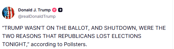 «Ο ΤΡΑΜΠ ΔΕΝ ΗΤΑΝ ΣΤΟ ΨΗΦΟΔΕΛΤΙΟ ΚΑΙ ΤΟ SHUTDOWN ΗΤΑΝ ΟΙ ΔΥΟ ΛΟΓΟΙ ΠΟΥ ΟΙ ΡΕΠΟΥΜΠΛΙΚΑΝΟΙ ΕΧΑΣΑΝ ΤΙΣ ΕΚΛΟΓΕΣ ΑΠΟΨΕ», έγραψε ο Τραμπ, επικαλούμενος «δημοσκόπους» χωρίς να τους κατονομάζει. Πρόκειται για την πρώτη του δημόσια τοποθέτηση μετά τα αποτελέσματα της Τρίτης, τα οποία έδειξαν απώλειες για το Ρεπουμπλικανικό Κόμμα σε καίριες αναμετρήσεις.