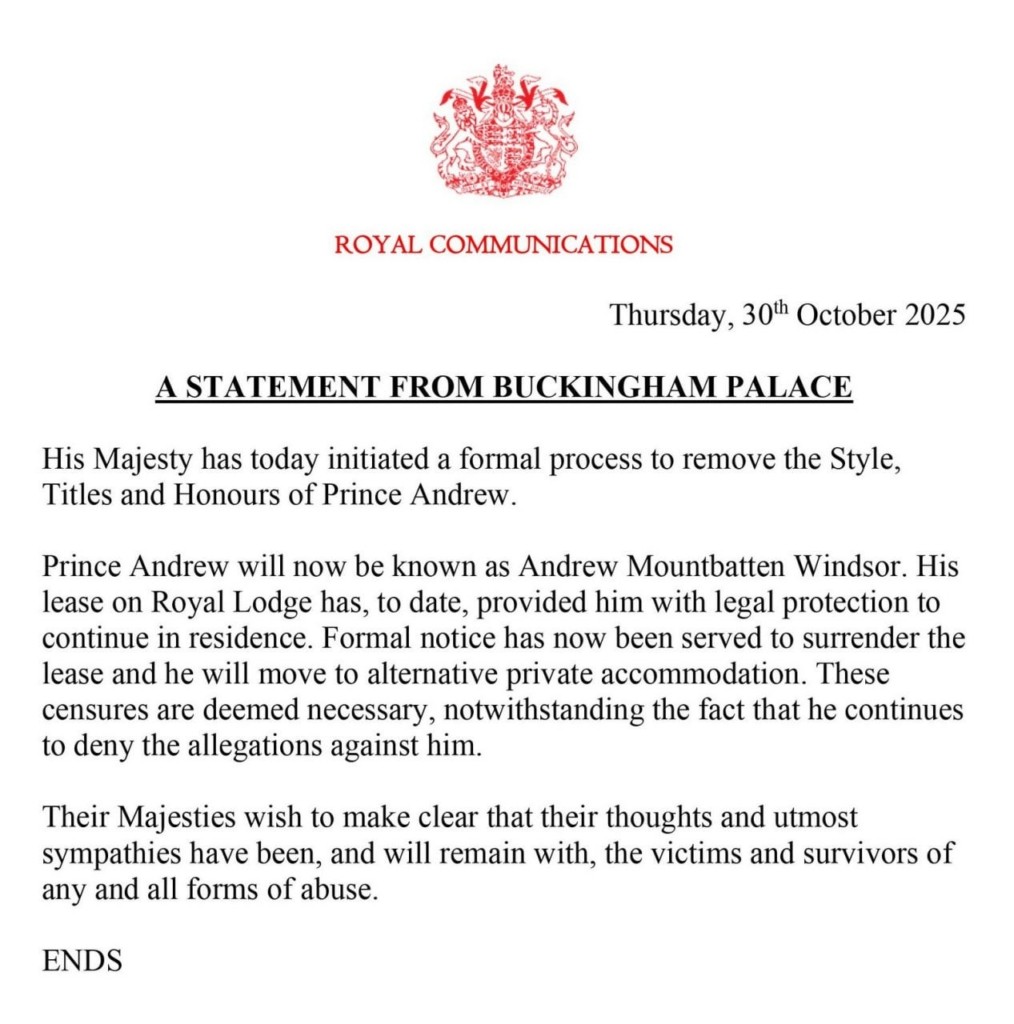 «Η Αυτού Μεγαλειότης ξεκίνησε σήμερα επίσημη διαδικασία για την αφαίρεση του τίτλου, των προσφωνήσεων και των τιμητικών διακρίσεων του Πρίγκιπα Άντριου.