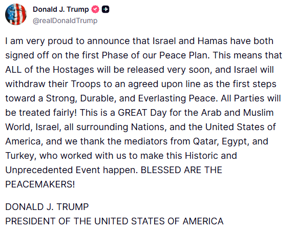 «Αυτό σημαίνει πως όλοι οι όμηροι θα απελευθερωθούν πολύ σύντομα», δήλωσε ο Τραμπ, προσθέτοντας ότι το Ισραήλ «θα αποσύρει τα στρατεύματά του σύμφωνα με τη συμφωνία», κάνοντας λόγο για τα «πρώτα βήματα προς μια Ισχυρή, Διαρκή και Αιώνια ειρήνη».