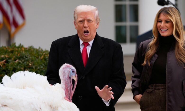 Ο Πρόεδρος Τραμπ των ΗΠΑ έδωσε χάρη στις γαλοπούλες Γκομπλ και Γουάντλ έξω από τον Λευκό Οίκο την Τρίτη, ενώ αστειεύτηκε ότι οι παλιές αμνηστίες του πρώην προέδρου Μπάιντεν στις γαλοπούλες είναι άκυρες λόγω της χρήσης του συστήματος αυτόματης υπογραφής.