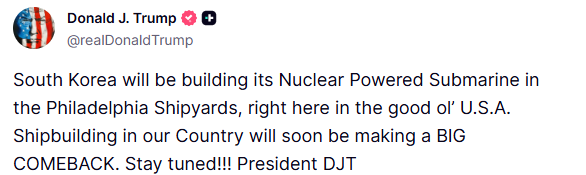 Ο πρόεδρος των ΗΠΑ Ντόναλντ Τραμπ γνωστοποίησε, μέσω ανάρτησής του στην πλατφόρμα Truth Social, ότι άναψε το πράσινο φως στη Νότια Κορέα προκειμένου να ναυπηγήσει πυρηνοκίνητο υποβρύχιο.