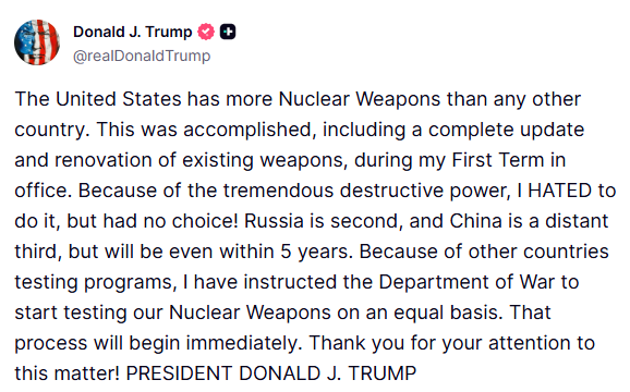 «Εξαιτίας των δοκιμών από άλλες χώρες, έδωσα εντολή στο υπουργείο Πολέμου (σ.σ. όπως έχει μετονομαστεί το υπουργείο Άμυνας των ΗΠΑ) να αρχίσει δοκιμές των πυρηνικών μας όπλων επί ίσοις όροις. Αυτή η διαδικασία θα ξεκινήσει αμέσως», τόνισε ο Ντόναλντ Τραμπ.