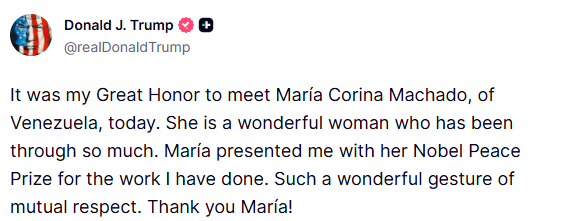 «Ήταν μεγάλη μου τιμή να συναντήσω σήμερα τη Μαρία Κορίνα Ματσάδο από τη Βενεζουέλα. Είναι μια υπέροχη γυναίκα που έχει περάσει πάρα πολλά. Η Μαρία μού προσέφερε το Νόμπελ Ειρήνης της για το έργο που έχω κάνει. Μια τόσο υπέροχη χειρονομία αμοιβαίου σεβασμού. Σε ευχαριστώ, Μαρία!»