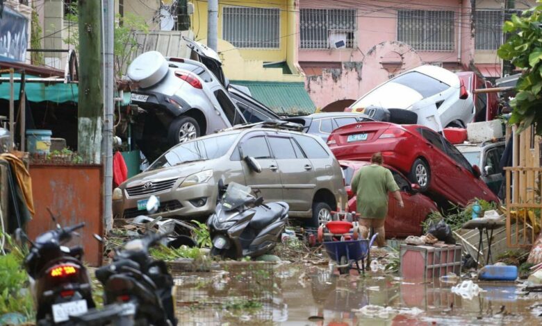 Πόλεις ολόκληρες στο νησί Τσεμπού (κεντρικές Φιλιππίνες) έχουν πλημμυρίσει, με τους κατοίκους να προσπαθούν να βρουν καταφύγιο στις στέγες για να ξεφύγουν από τα λασπώδη νερά που παρασύρουν αυτοκίνητα, φορτηγά, τεράστια εμπορευματοκιβώτια.