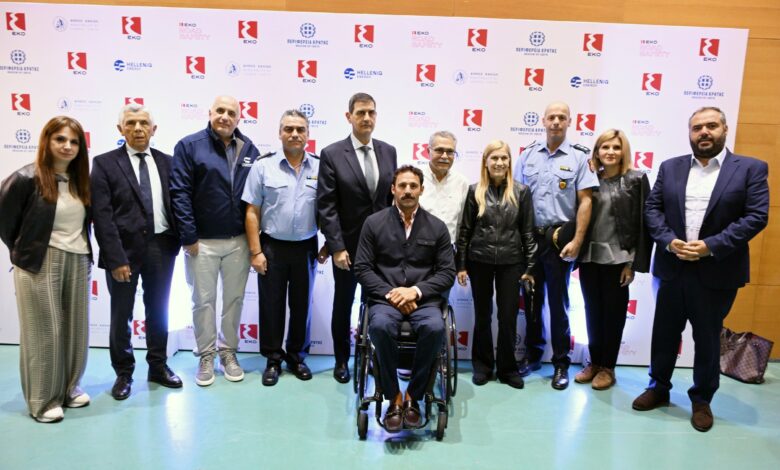 Στιγμιότυπο από την εκδήλωση στο Ηράκλειο. Από αριστερά, Γιώργος Σισαμάκης, Αντιδήμαρχος Τεχνικών Υποδομών & Βιώσιμης Κινητικότητας Δ. Ηρακλείου, Γεώργιος Δανδουλάκης- Πλωτάρχης Λ.Σ – Διοικητής Λιμενικής Αστυνομίας, Στέλιος Καρακούδης Διοικητής Τροχαίας Ηρακλείου, Γιάννης Λιονάκης, Πρόεδρος Εθελοντικού Συλλόγου Πρόληψης Τροχαίων Ατυχημάτων Ε.ΣΥ.ΠΡΟΤΑ, Γεωργία Λασανιάνου, Διευθύντρια Εταιρικής Υπευθυνότητας, HELLENiQ ENERGY, Αντώνης Τσαπατάκης, Παραολυμπιονίκης και Παγκόσμιος Πρωταθλητής στην κολύμβηση, Χριστίνα Μηλιαράκη, Διευθύντρια Marketing, EKO, Τάκης Πουρναράκης, Πρόεδρος MotorSport Greece, Σωτήρης Αναστασιάδης, Διευθυντής Εταιρικών Σχέσεων, HELLENiQ ENERGY.