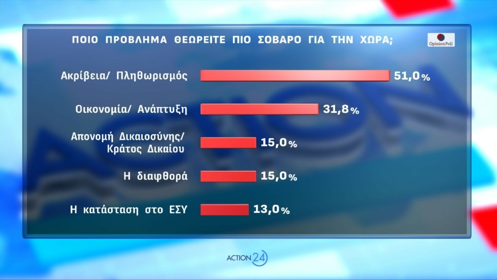 Στα προβλήματα που θεωρούνται ως τα πιο σοβαρά κυριαρχεί η ακρίβεια με 51% και ακολουθούν η Οικονομία/ Ανάπτυξη 31.8%, η Απονομή Δικαιοσύνης / Κράτος Δικαίου με 15%, η διαφθορά με 15%, η κατάσταση στο Ε.Σ.Υ με 13%, το κόστος ενέργειας με 11.2%, τα Εθνικά θέματα / ελληνοτουρκικά με 9.1%, το ύψος των εισοδημάτων κ.λ.π .