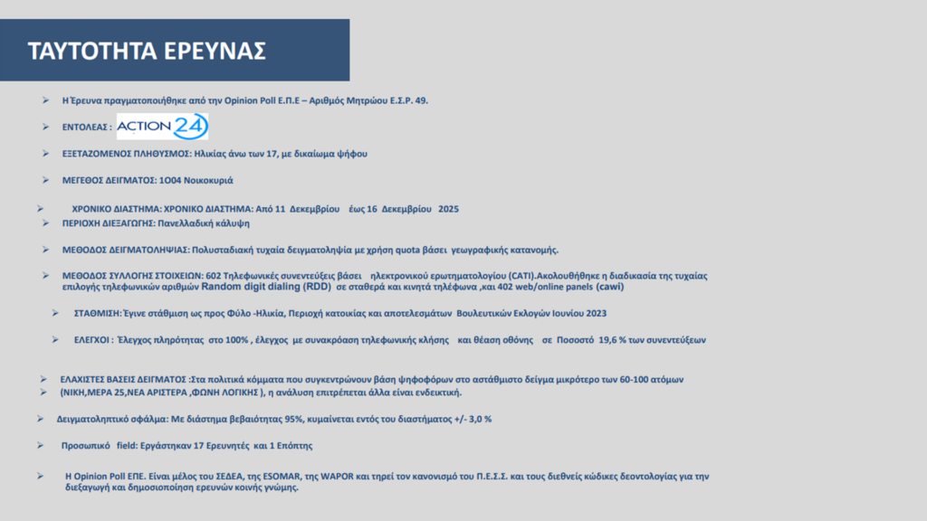 Είναι χαρακτηριστικό ότι στο ερώτημα «Τι σας ανησυχεί περισσότερο για το 2026» πρώτη απάντηση είναι η συνέχιση της ακρίβειας με 28.9%, «η προσωπική οικονομική κατάσταση» με 24.9%, η κατάσταση της προσωπικής και οικογενειακής υγείας με 7.4%, η πολιτική αστάθεια με 7.1%, οι γεωστρατηγικές αναταράξεις με 5.1%, τυχόν θερμό επεισόδιο με Τουρκία με 4% κ.λ.π