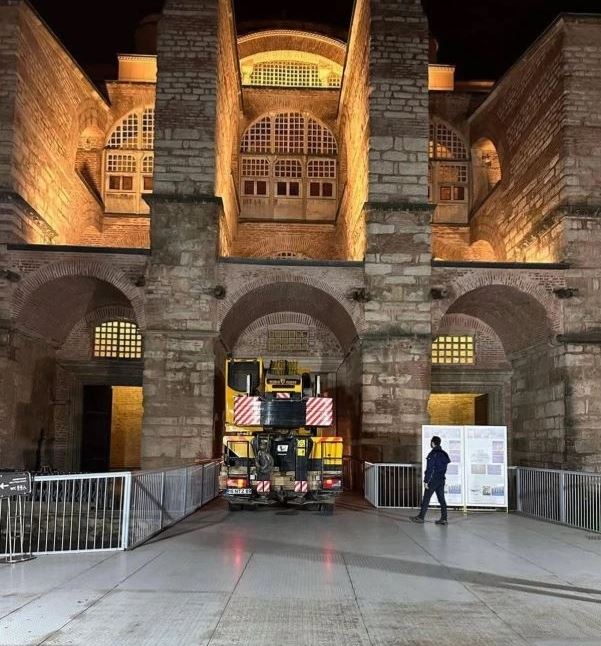 Φωτογραφίες με έναν μεγάλο γερανό, τοποθετημένο πάνω σε φορτηγό, να διασχίζει το δάπεδο του ναού προκάλεσαν παγκόσμιο ενδιαφέρον, αλλά και έντονη ανησυχία για την ασφάλεια της δομής, ειδικά την ώρα που βρίσκονται σε εξέλιξη έργα αντισεισμικής θωράκισης.