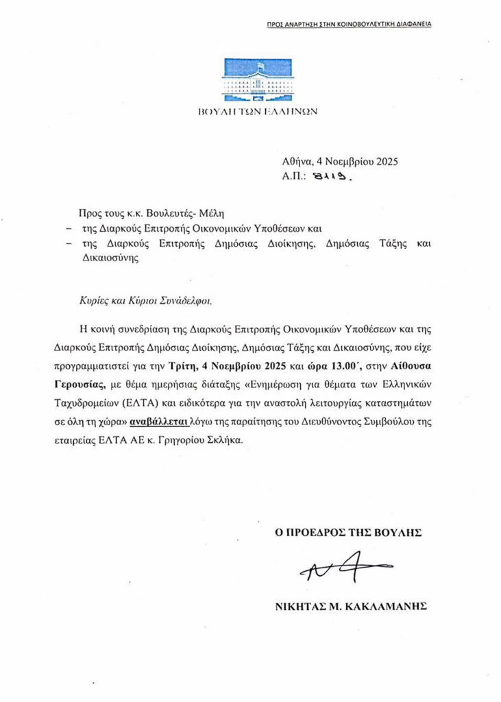 Σημειώνεται πως την αναβολή της κοινής έκτακτης συνεδρίασης των επιτροπών Οικονομικών Υποθέσεων και Παραγωγής και Εμπορίου της Βουλής για τα ΕΛΤΑ έφερε η παραίτηση του CEO του Οργανισμού, Γρηγόρη Σκλήκα, κάτι που ανακοίνωσε και επίσημα ο πρόεδρος της Βουλής, Νικήτας Κακλαμάνης.