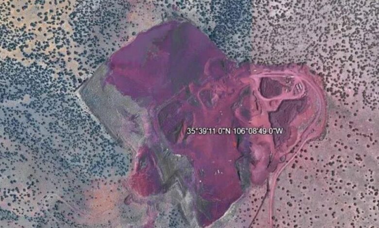 Οι φωτογραφίες από την Google Earth δείχνουν μια απομακρυσμένη περιοχή του βόρειου Νέου Μεξικού, ακριβώς βορειοδυτικά της Σάντα Φε, με το έδαφος να έχει ένα βαθύ κόκκινο χρώμα.