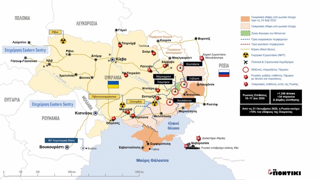Η σύγκρουση στην Ουκρανία παραμένει ένα σύνθετο μείγμα διπλωματικής διαπραγμάτευσης και στρατιωτικής έντασης. Οι τελευταίες εξελίξεις καταδεικνύουν ότι, παρά τις διεθνείς προσπάθειες για ειρηνευτική συμφωνία, τα μέτωπα παραμένουν ενεργά, οι επιθέσεις συνεχίζονται και οι υποδομές στρατηγικής σημασίας παραμένουν στόχος τόσο των ρωσικών όσο και των ουκρανικών δυνάμεων.