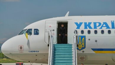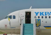 Προς την πορεία του αεροσκάφους του Ουκρανού προέδρου Βολοντίμιρ Ζελένσκι πάνω από τη θάλασσα, κοντά…