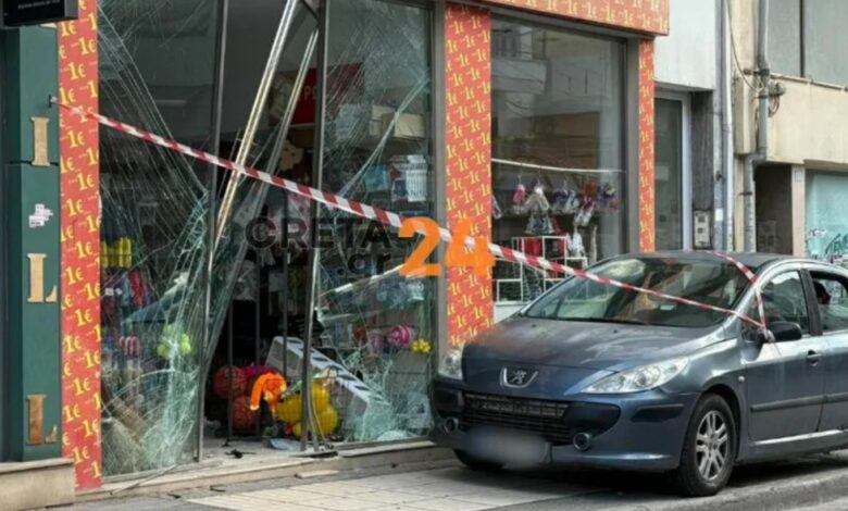 Πανικός στο κέντρο του Ηρακλείου: Αυτοκίνητο «καρφώθηκε» σε βιτρίνα καταστήματος