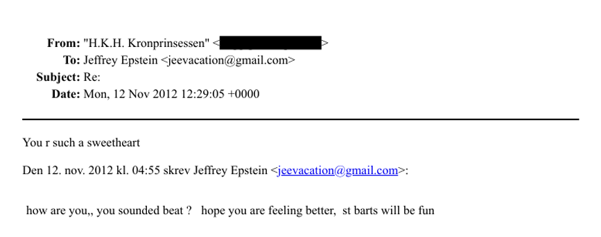 Σε άλλο mail, ο Έπσταϊν γράφει ότι γνώρισε δύο Νορβηγίδες 24 και 25 ετών και προσθέτει: «Μου αρέσει το Όσλο». Η απάντηση που αποδίδεται στην πριγκίπισσα είναι χαρακτηριστική: «Τα κορίτσια είναι 24 και 25; Μου αρέσει κι εμένα το Όσλο.»