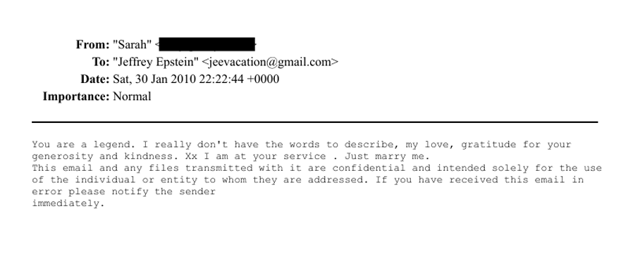 Σε ένα email του 2012 προς τον Έπσταϊν εμφανίζεται η φράση: «You r such a sweetheart» («Είσαι τόσο γλυκός»).